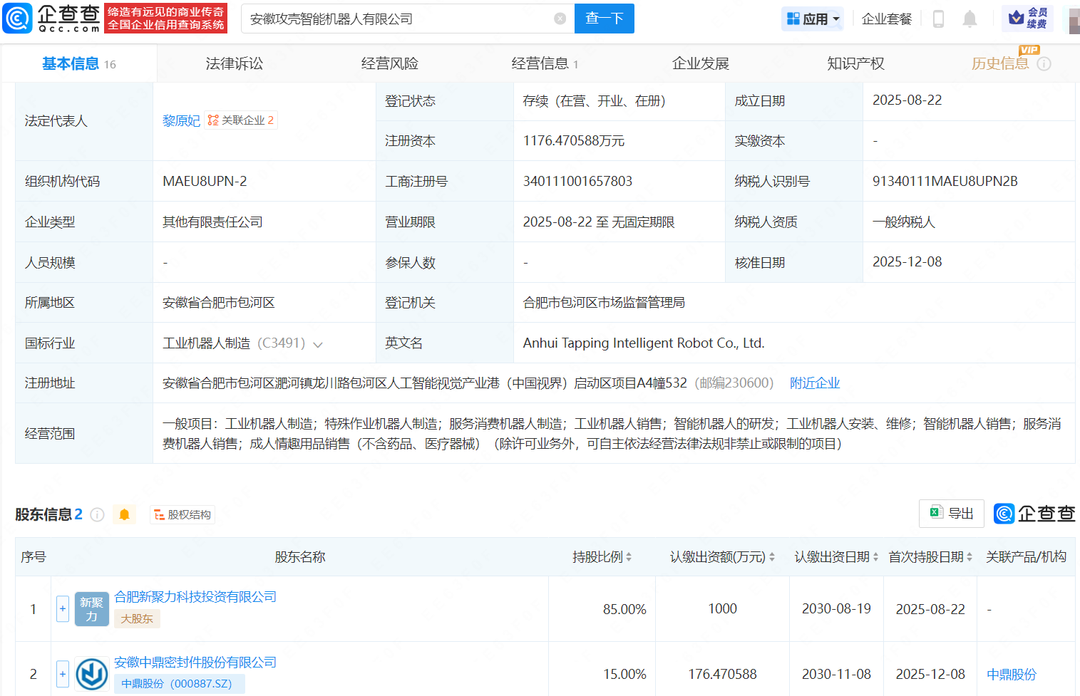 近日,安徽攻壳智能机器人有限公司发生工商变更,新增中鼎股份(000887)为股东,注册资本由1000万元增至约1176万元,增幅约17.65%。企查查信息显示,该公司成立于2025年8月,法定代表人为黎原妃每日配资网站,经营范围包含工业机器人制造、特殊作业机器人制造、服务消费机器人制造等,现由合肥新聚力科技投资有限公司、中鼎股份(000887)共同持股。